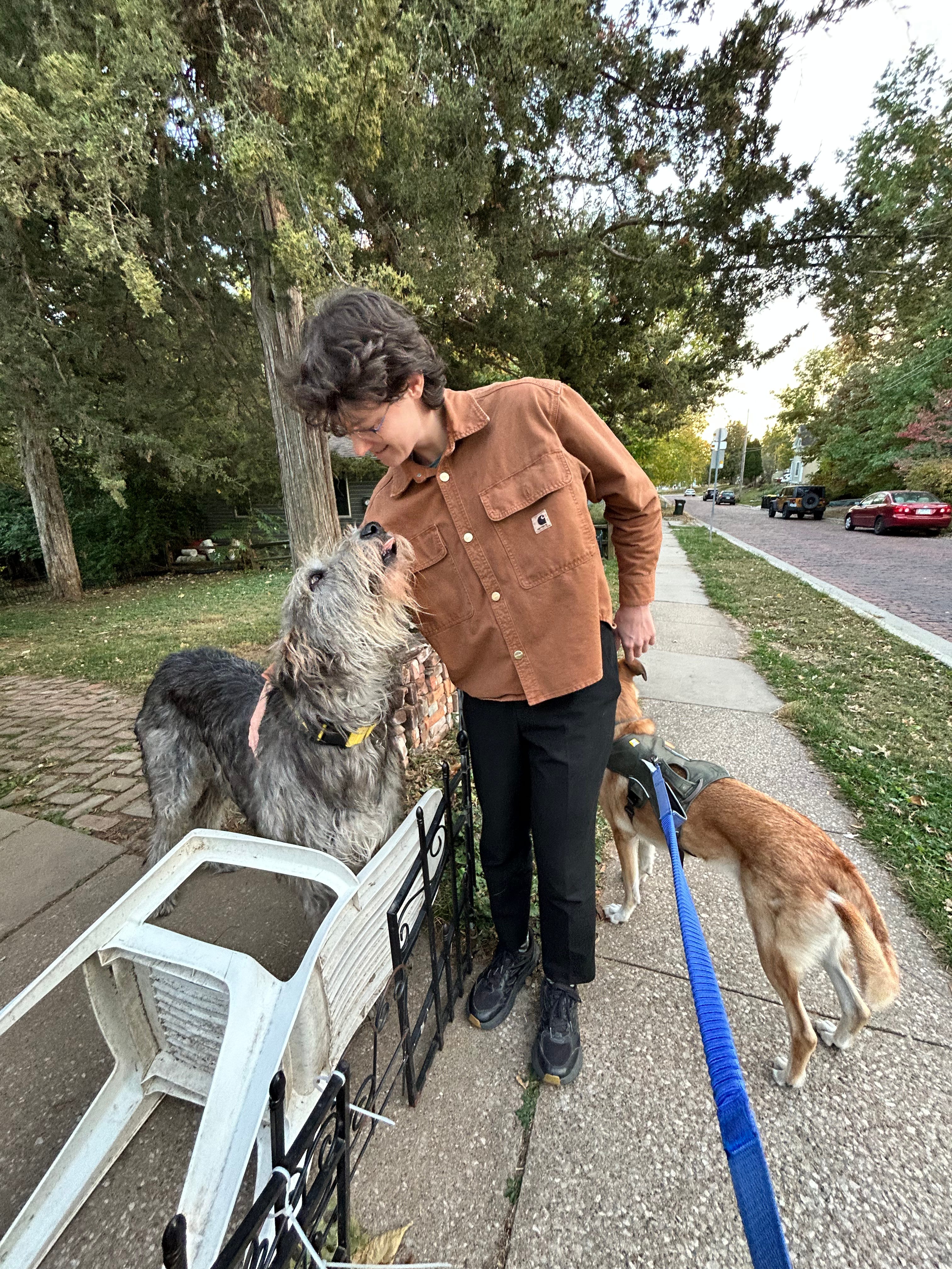 Junior yelled at her for a minute or two before getting distracted by watching for deer and cats, a task that remains her once and future life passion. Sequoia didn’t seem to mind. She likes Junior just fine, but she loves anyone who will stop to pet her. She puts her huge skull in your hands to cradle and looks up at you with these big, soulful eyes that are partially covered by her greasy bangs (the exact look I was shooting for in middle school). Sequoia’s mom is Josephine, an older woman with long white hair who grew up in Iowa City but has lived all over the world. Occasionally she’ll come out and chat when I’m petting Sequoia. I asked her one time why she came back to Iowa City, and she told me it was the same reason everyone else did: because she was chasing “some guy” whom she eventually dumped and then got her first Irish wolfhound. End of story.