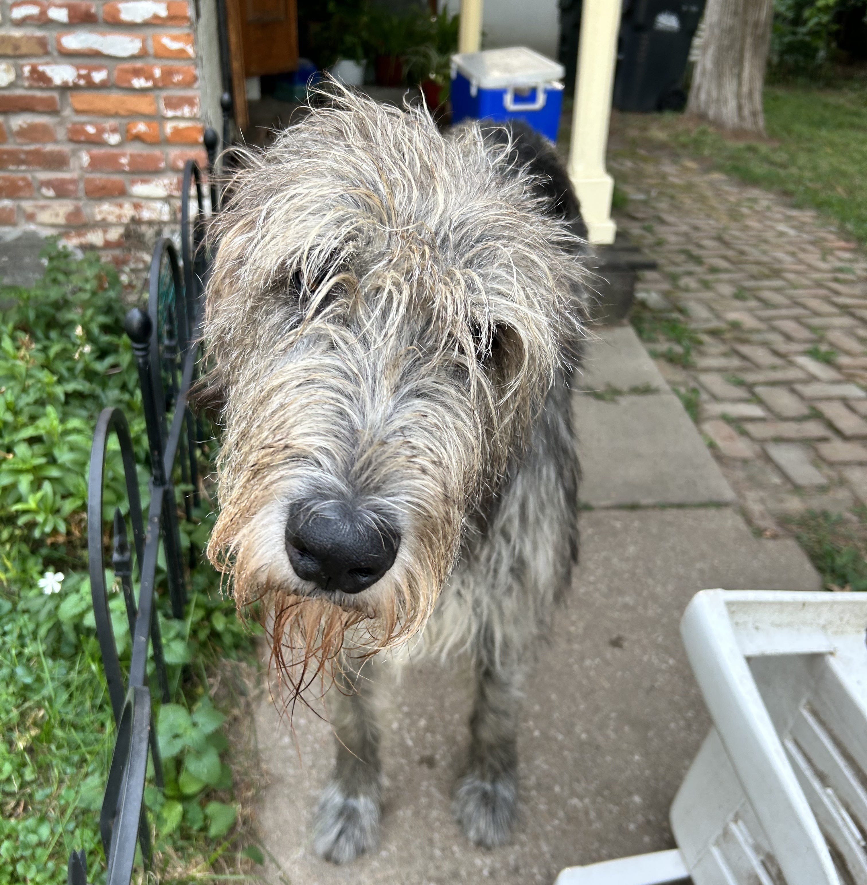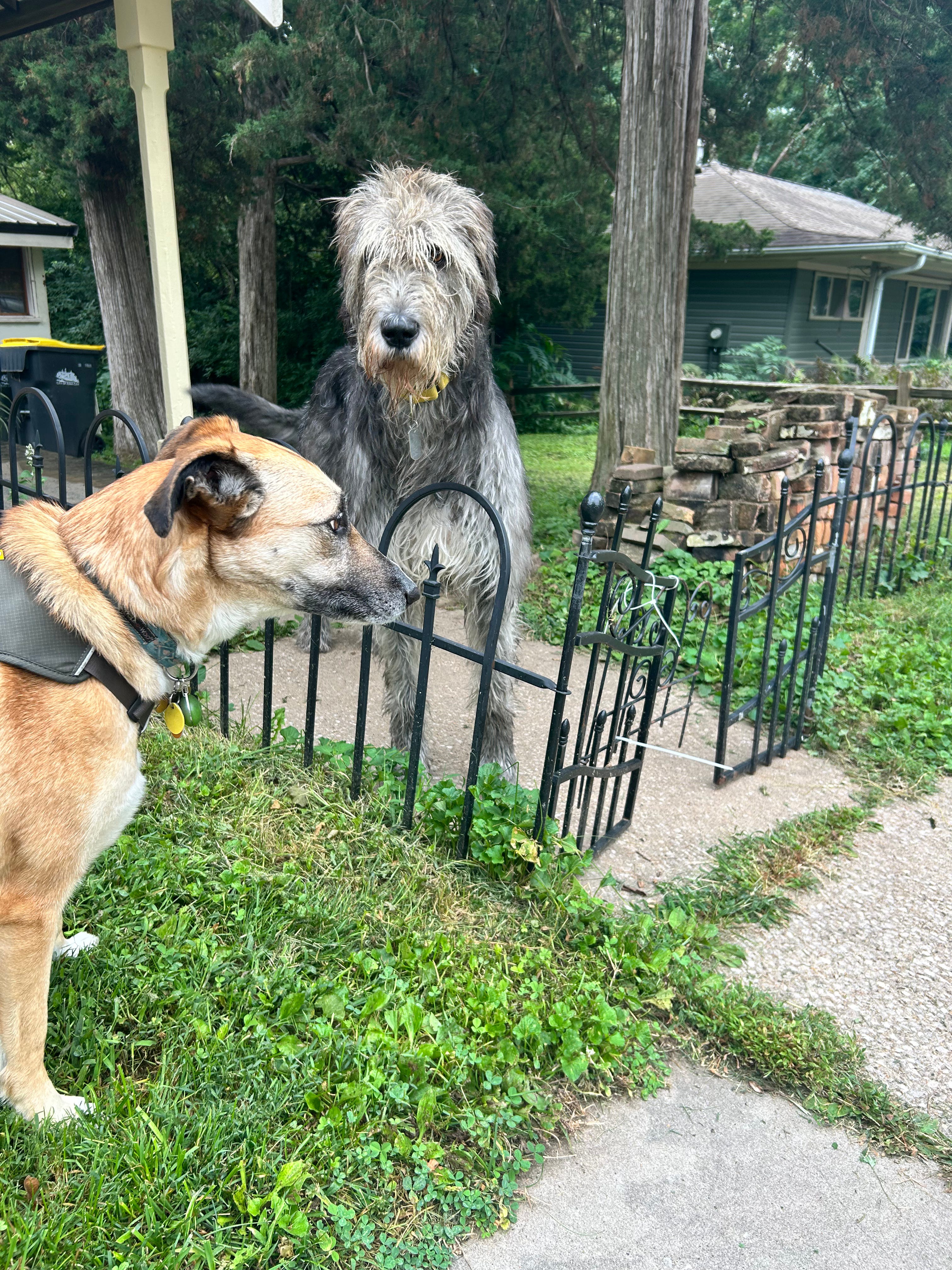 I make a point to walk by Sequoia’s house at least once a day to try and pet her. All you have to do is whisper-cry “Sequoia. Sequoia!” and if she’s already outside or the front door is open, she’ll come lumbering out of the house as if she’s been craving the moment for someone to call her name. If you can’t already tell, I love her very much and am trying hard to make an urban legend out of her. I’ve told my writing colleagues, and now all of you, about the friendly Irish wolfhound who appears upon being called like a kind, furry Rumpelstiltskin, only her friendship doesn’t require me to hand over my future firstborn child. But I would, if that’s what it takes.